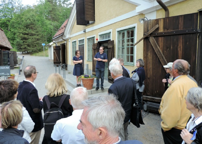 Dagens värd Richard Kjellgren tillsammans med en medhjälpare berättar om vad som skall ske under besöket på Tumba bruksmuseum.
