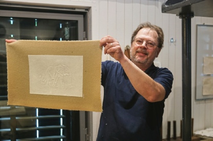 Richard Kjellgren demonstrerar hur man gör ett pappersark med ett vackert vattenmärke.